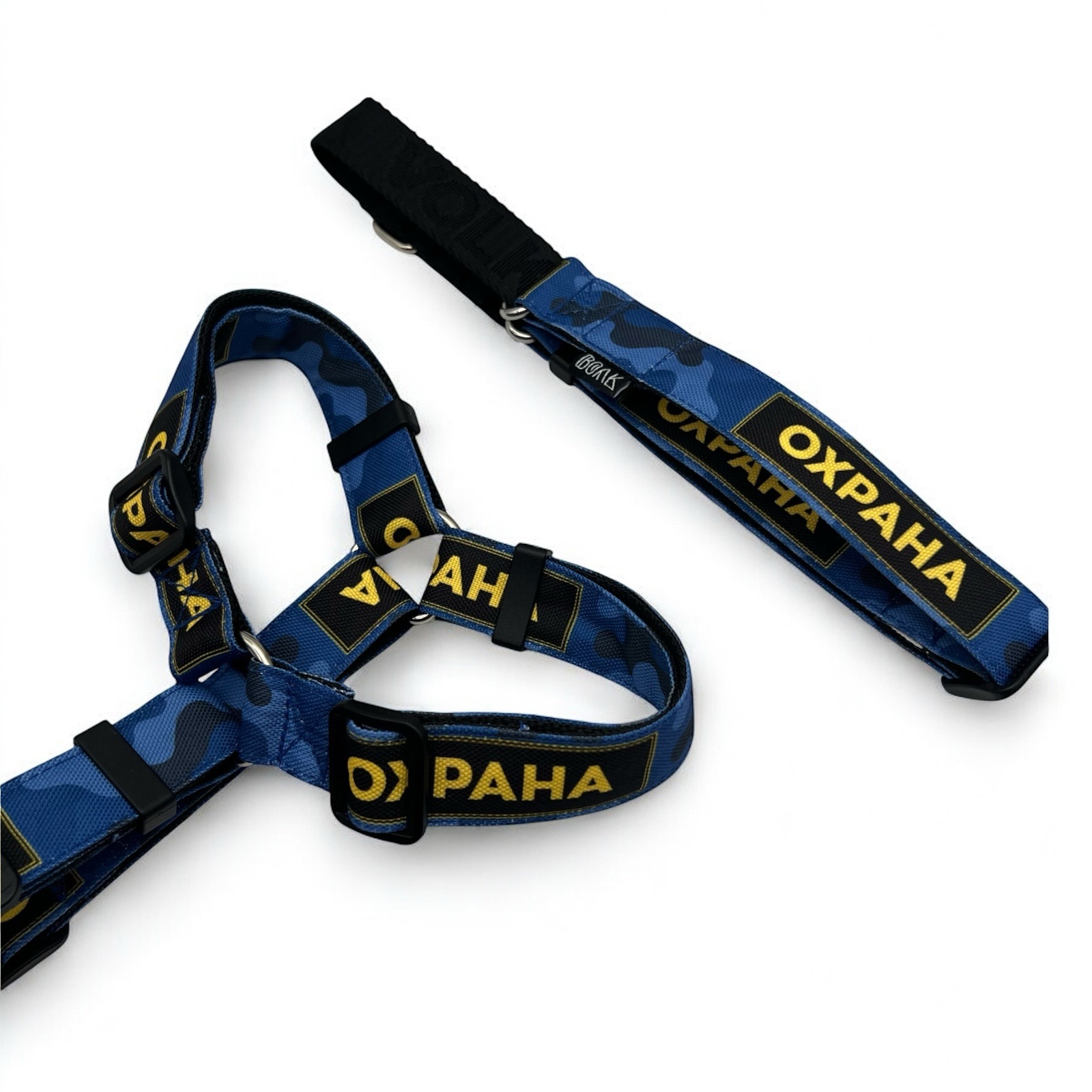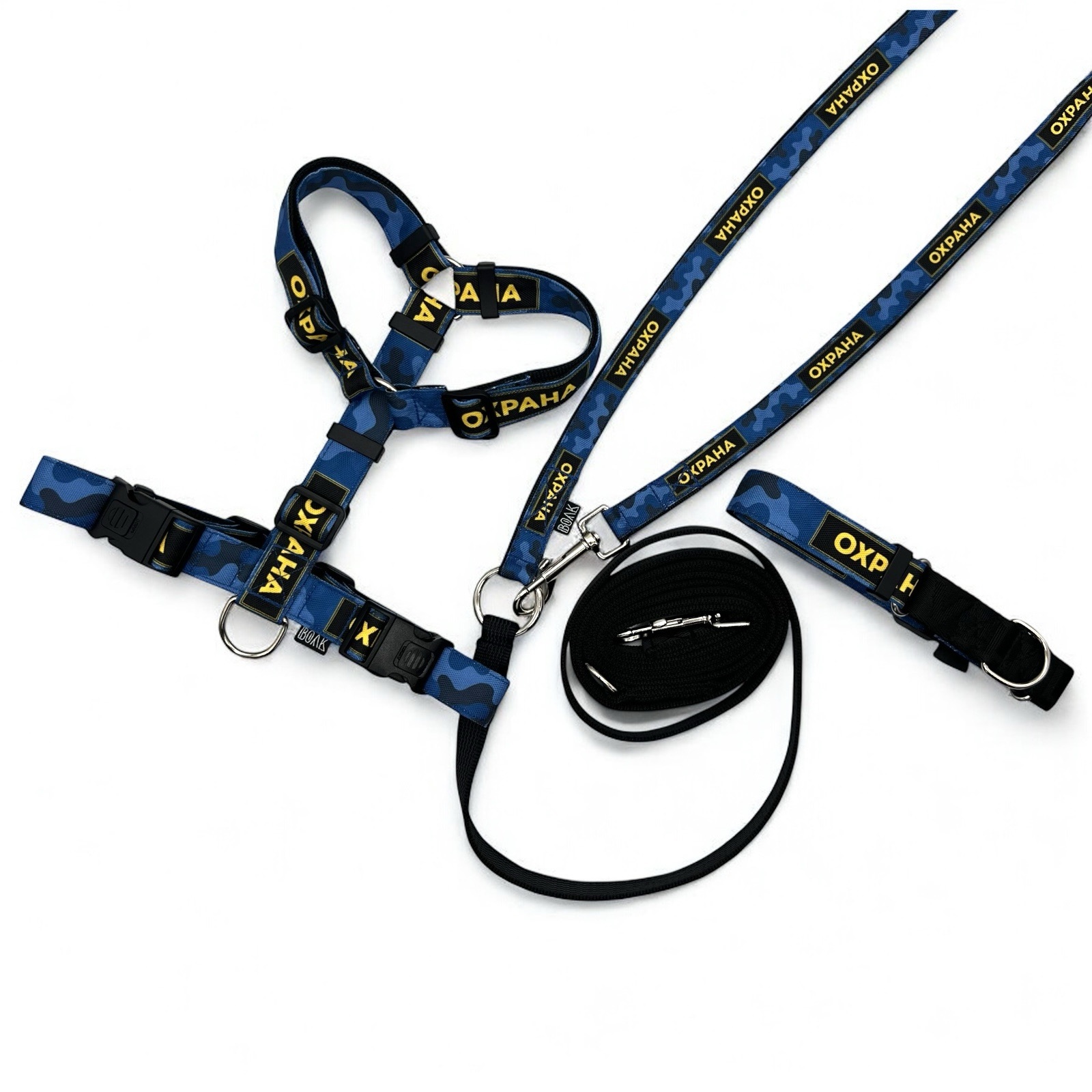 Шлейка, поводок/перестёжка и ошейник из коллекции «Защитник» — тем, кто не притворяется милым, а сразу внушает уважение.