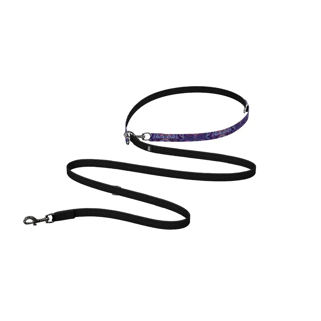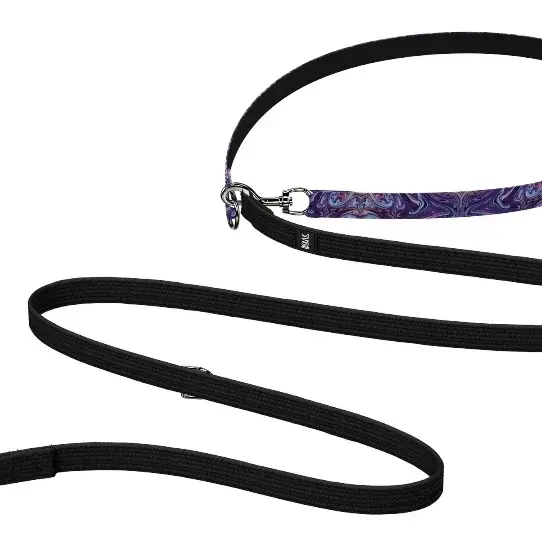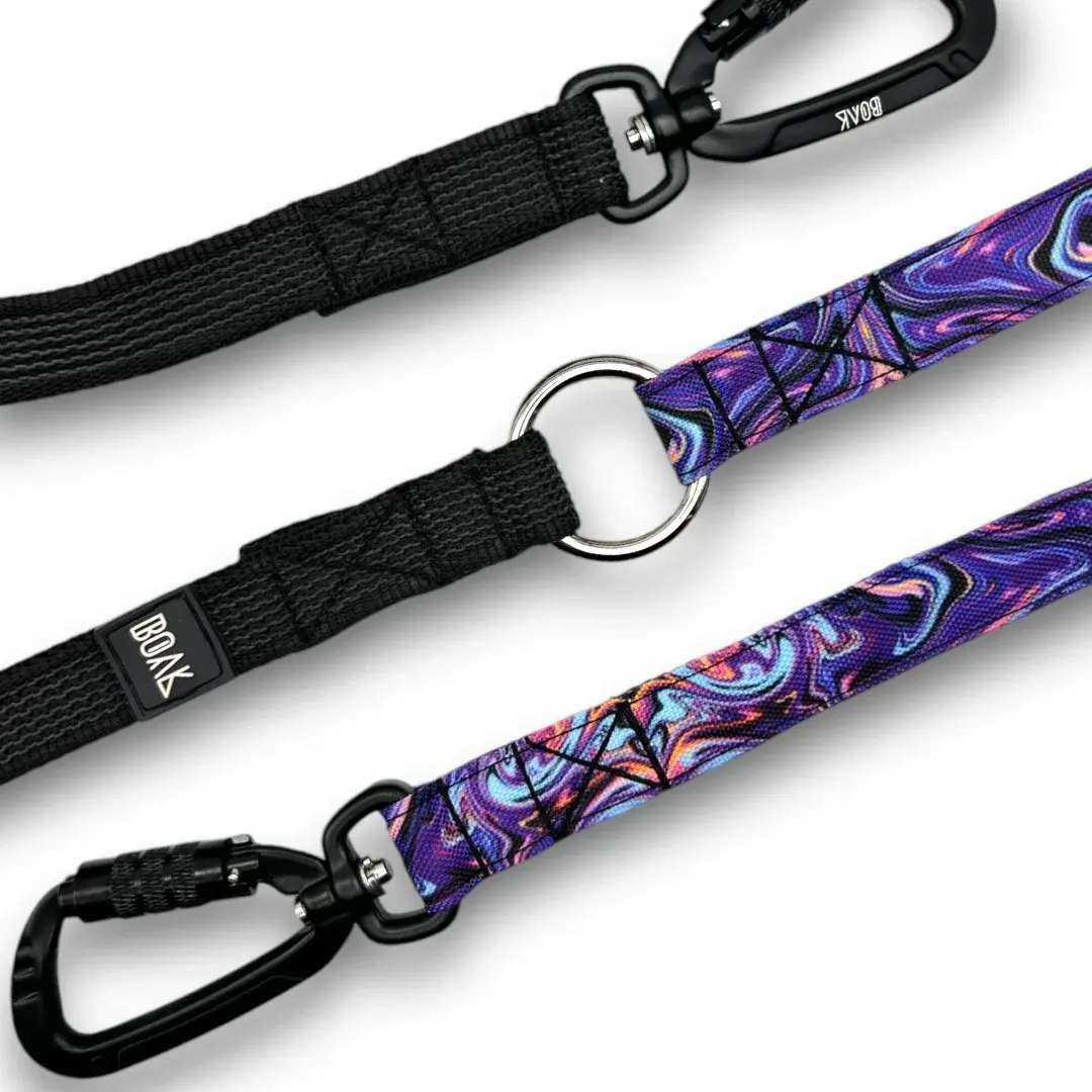 Перестежки имеют два карабина на концах и несколько полуколец по всей длине поводка. Один карабин крепится к шлейке/ошейнику, второй, в зависимости от выбора полукольца, делает из перестежки: