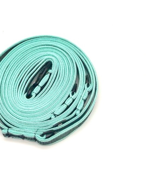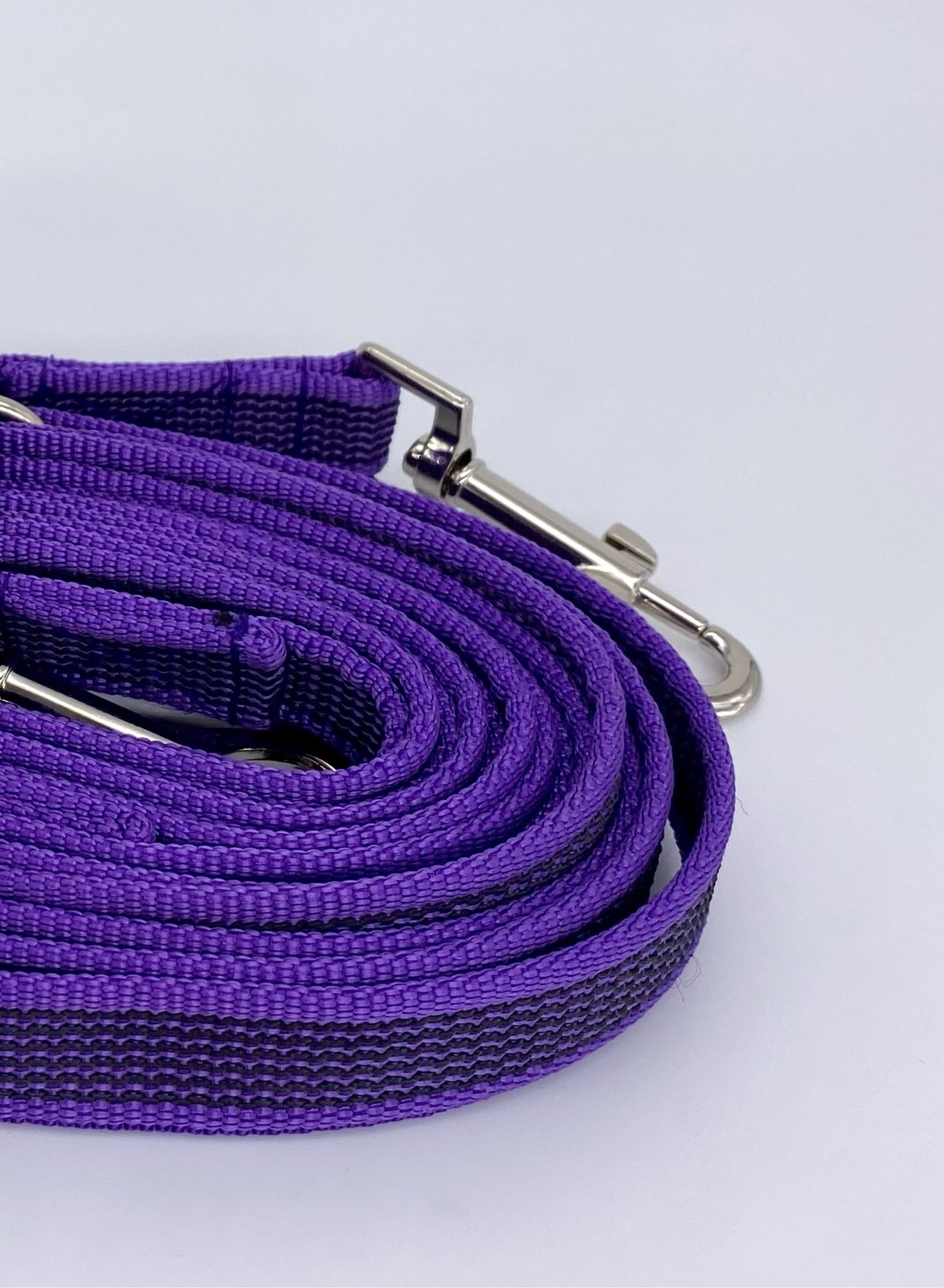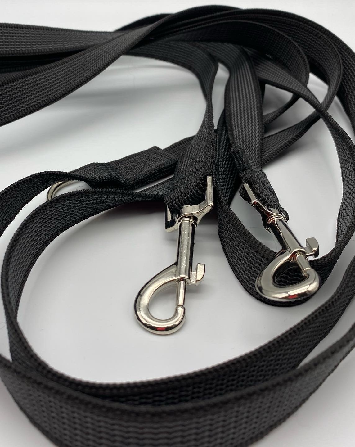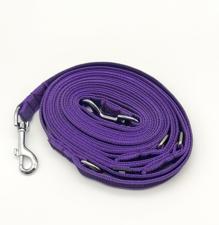 Перестежки имеют два карабина на концах и несколько полуколец по всей длине поводка. Один карабин крепится к шлейке/ошейнику, второй, в зависимости от выбора полукольца, делает из перестежки: