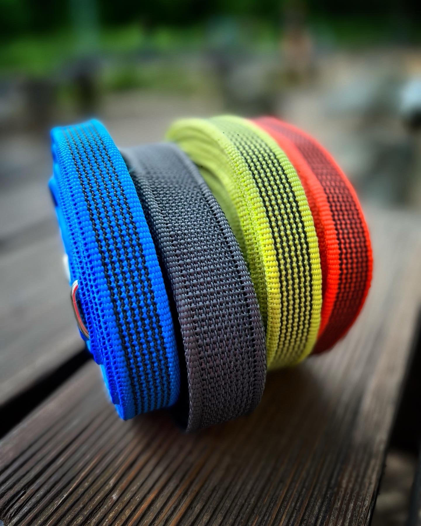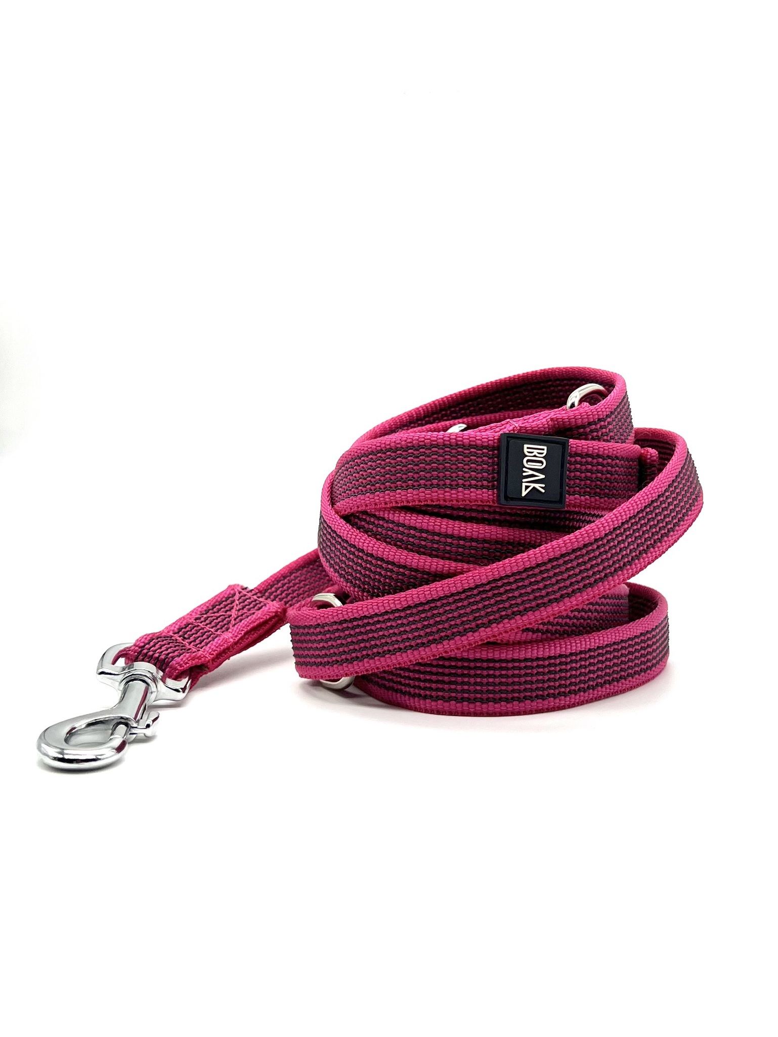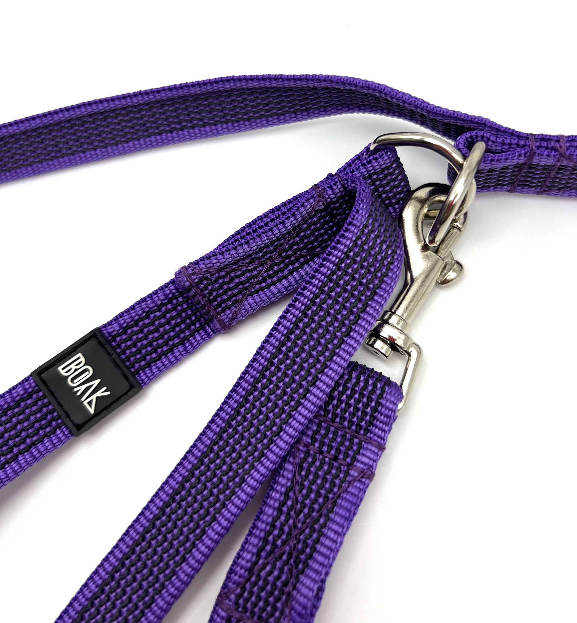 Перестежки имеют два карабина на концах и несколько полуколец по всей длине поводка. Один карабин крепится к шлейке/ошейнику, второй, в зависимости от выбора полукольца, делает из перестежки: